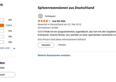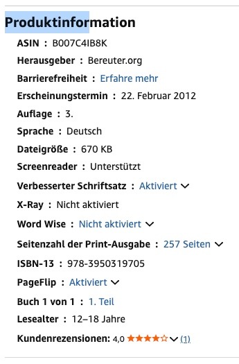Wieso auf Amazon noch immer Lesealter 12-18 steht, ist mir ein Rätsel. Es sollte "ab 12" oder 12 bis 100 heissen. Auch die Seitenanzahl kann nicht stimmen. Ein 100 seitiges pdf-file kann nicht 257 Print Seiten haben.